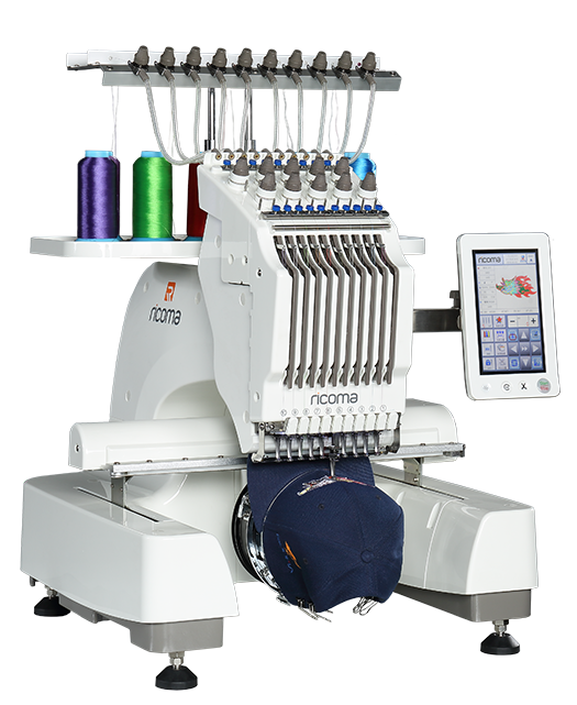 Available in 4 to 12 heads these high speed machines achieve high productivity whether embroidering caps piece work or made up garments. EM-1010 Single-head entry-level embroidery machine With 10 needles and a cap attachment this versatile entry-level embroidery machine is perfect for hobbyists startups or custom apparel. The Ricoma EM1010 8-in-1 device is designed to help users accomplish embroidery on items such as shirt pockets socks cap backs shirt sleeves collar tips and more.